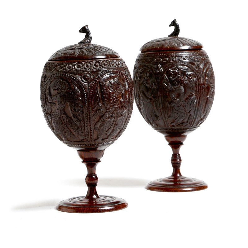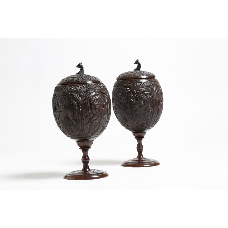 λ Two similar Indian carved coconut cups and covers, each decorated with a peacock and panels of figures, on a turned rosewood base, 19th century, 19.4cm high (max). (2)