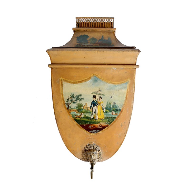 A 19th century continental tôle peinte lavabo wall fountain, with a galleried top, the body with printed scenes of classical figures and a lady and a gentleman promenading along a riverbank, with a gilt bearded male mask spout, 49.5cm high, 27.7cm wide.