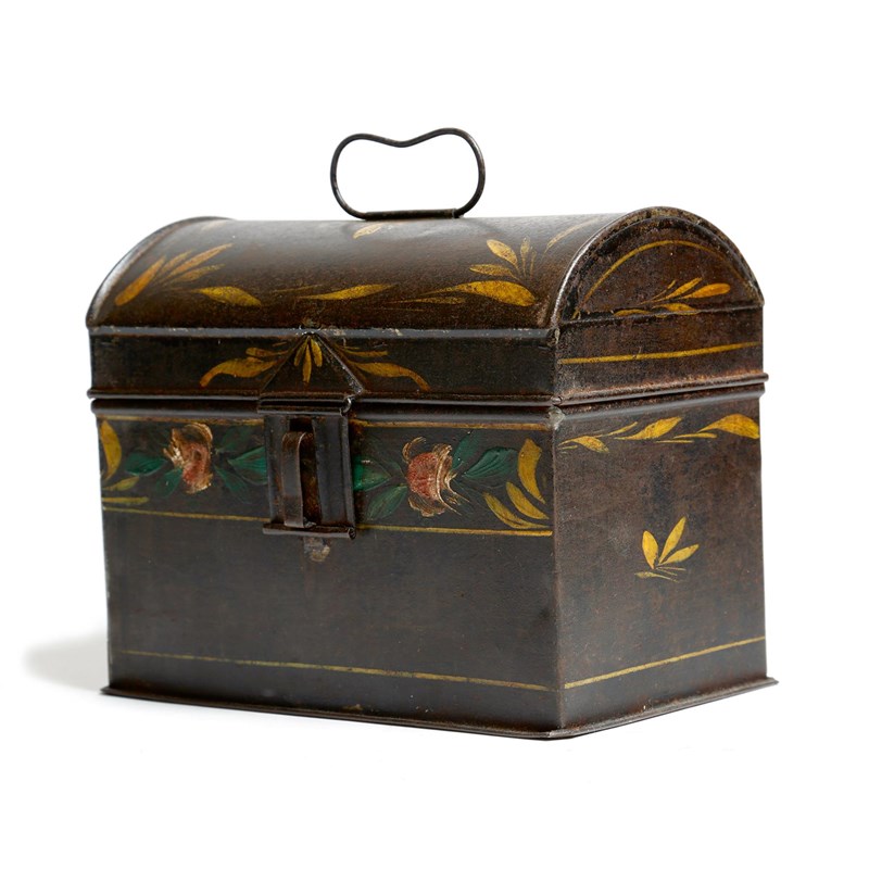 A 19th century tôle box, painted with flowers and leaves, the domed lid with a handle, probably American, 18.5cm high, 19.6cm wide.