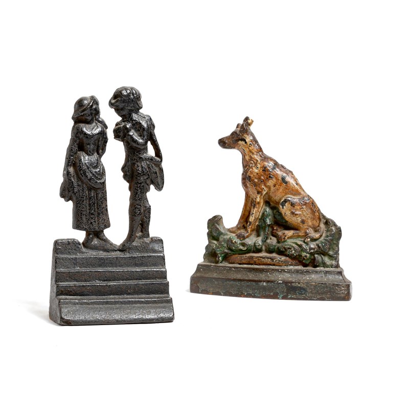 A Victorian cast iron doorstop, in the form of a seated dog, with painted decoration, together with a cast iron chimney ornament in the form of a boy and a girl standing on steps, 22.2cm high (max). (2)