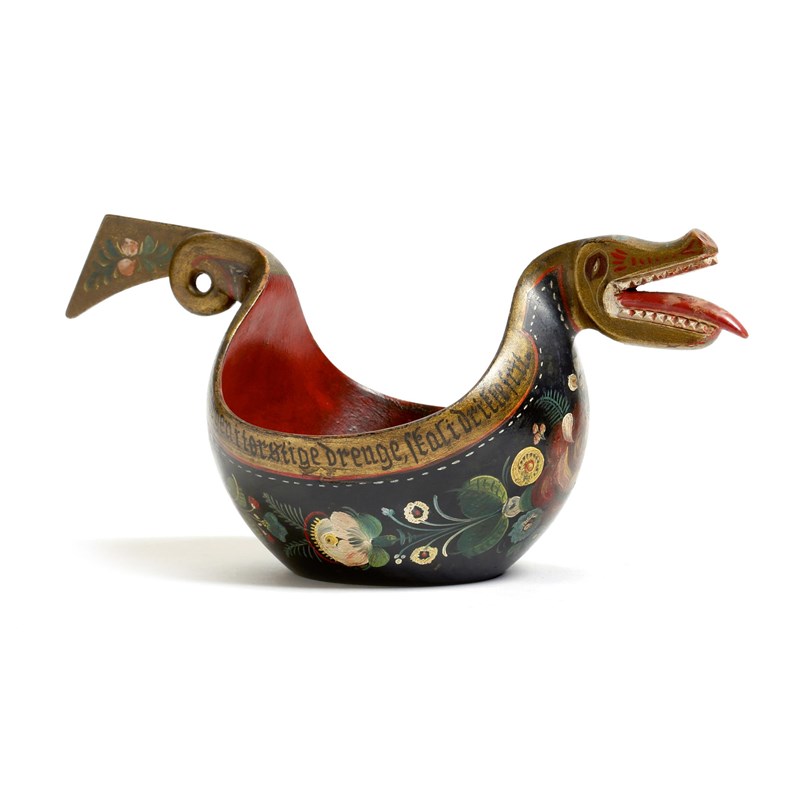 A Norwegian carved and painted wood kasa, in the form of a stylised dragon, painted with flowers and with bands of script, second half 19th century, 35.2cm wide.