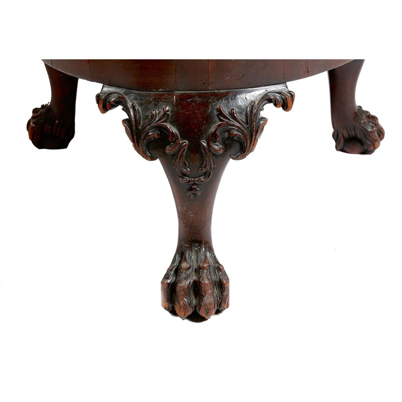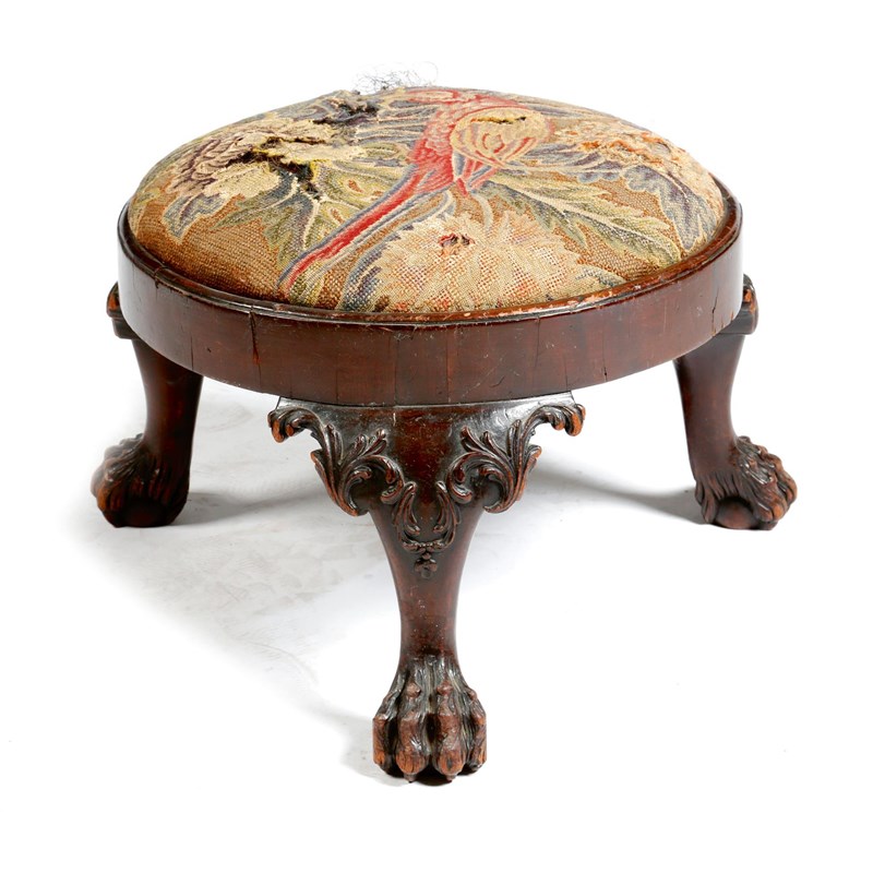 A George II mahogany circular stool, with a needlework seat worked with a parrot, on leaf carved tripod cabriole legs and hairy paw feet, on brass castors, the underside with an ivorine trade label inscribed 'FRANK PARTRIDGE WORKS OF ART 26, KING ST. ST. JAMES'S AND NEW YORK.', possibly Irish, 30.5cm high, 48cm wide.