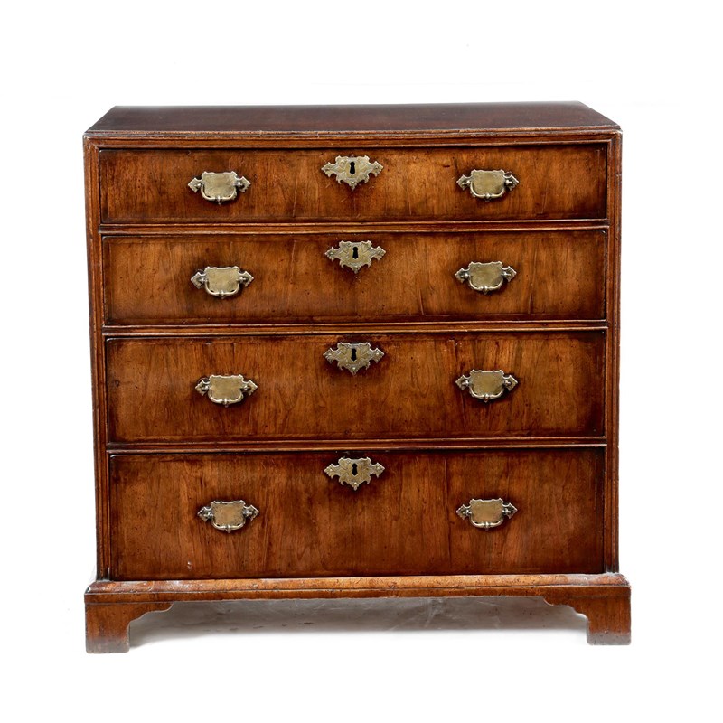 A George II walnut chest, cross and feather banded, the top with a caddy moulded edge, above four long graduated drawers, 76.5cm high, 79.5cm wide, 49cm deep.