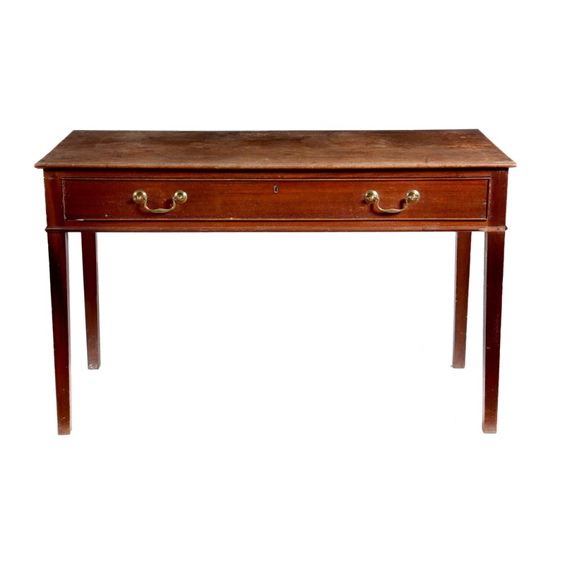 A George III mahogany side table, the rectangular top with a moulded edge, above a frieze drawer fitted with brass swan neck handles, on square tapering legs, 74.7cm high, 121.8cm wide, 55.3cm deep.