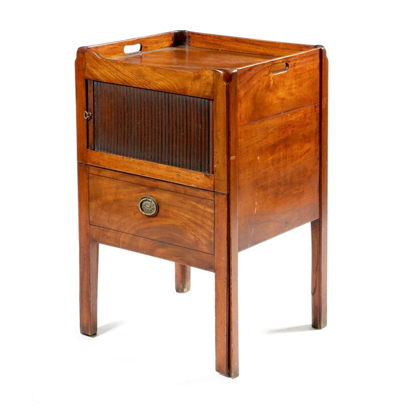 A George III mahogany tray-top bedside commode, the gallery pierced with a pair of handgrips above a tambour shutter and a converted pull-out base, 77.1cm high, 49.4cm wide, 43.3cm deep.