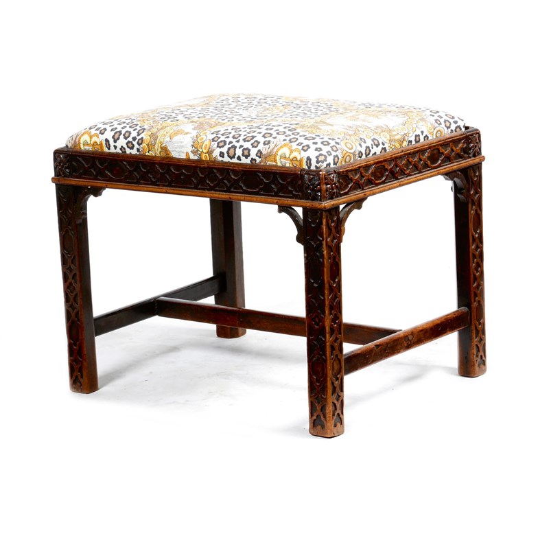 A mahogany Chinese Chippendale style stool, with a drop-in seat on blind fret carved chamfered legs united by an 'H' stretcher, 45.3cm high, 55cm wide, 43.5cm deep.