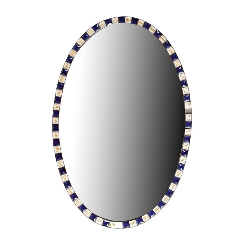 A George III and later Irish wall mirror, the replaced oval plate within a frame decorated with cut blue glass cabochons alternating with white and gilt panels, 75.5 x 49.7cm.