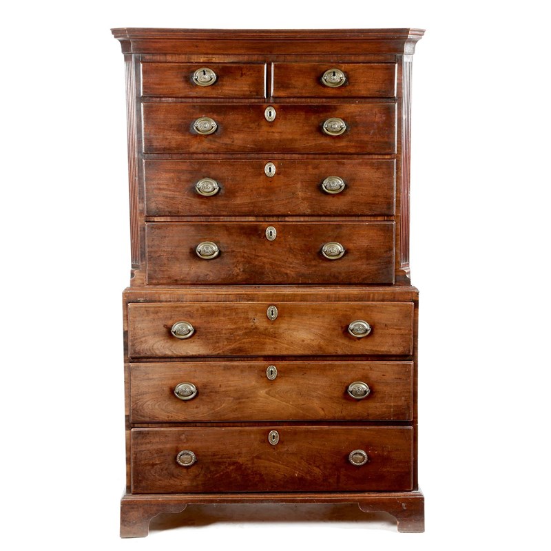 A George II mahogany chest on chest, the moulded cornice above two short and three long drawers, flanked by fluted angles, the base with three long drawers, 172.2cm high, 105cm wide, 50.2cm deep.