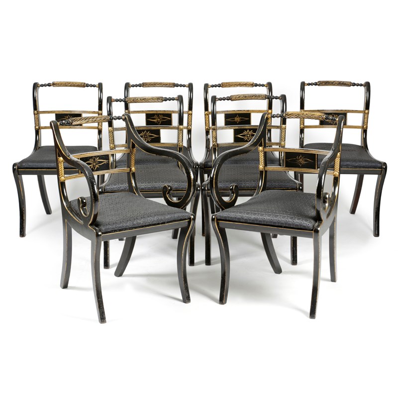 A SET OF EIGHT EBONISED DINING CHAIRS