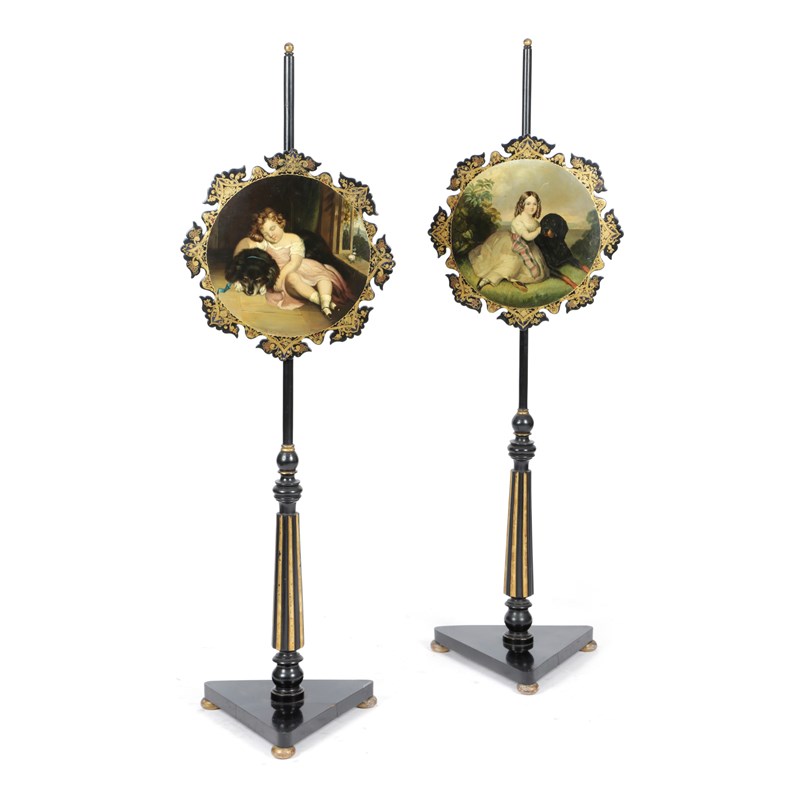 A PAIR OF EARLY VICTORIAN EBONISED AND PARCEL GILT POLE FIRESCREENS