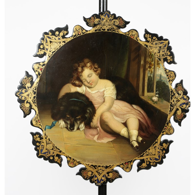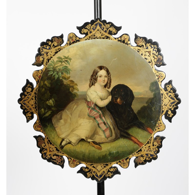 each with a papier-mâché adjustable screen painted with a girl and dog companion, titled 'The First Friend' and 'The Tired Times' (2)