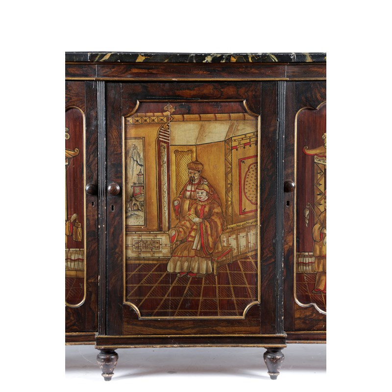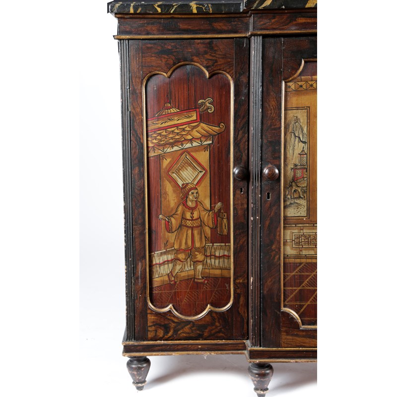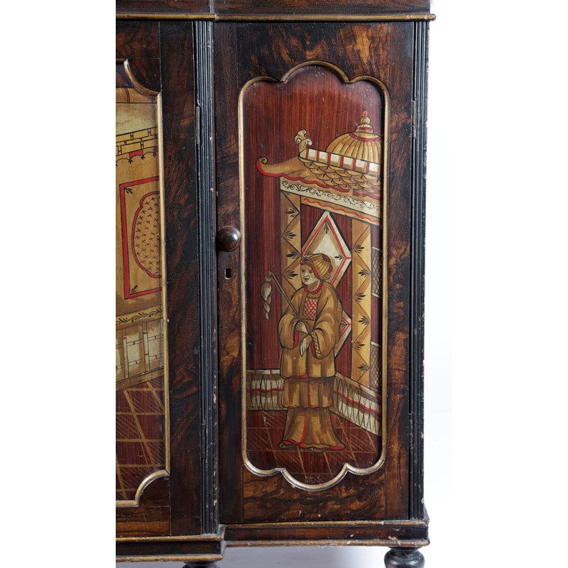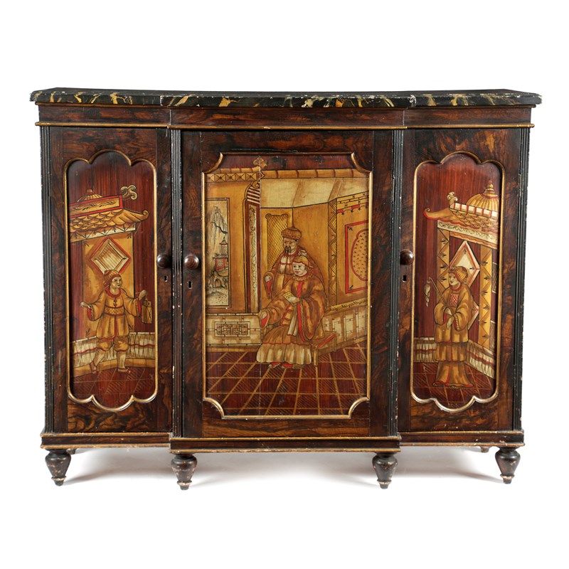 A REGENCY SIMULATED ROSEWOOD AND CHINOISERIE BREAKFRONT SIDE CABINET