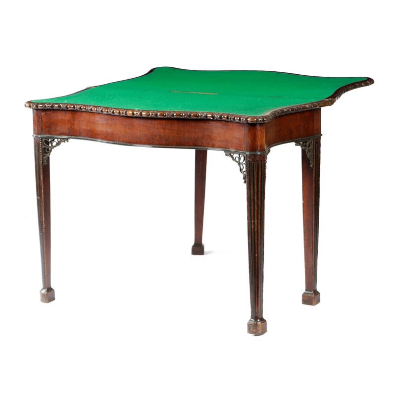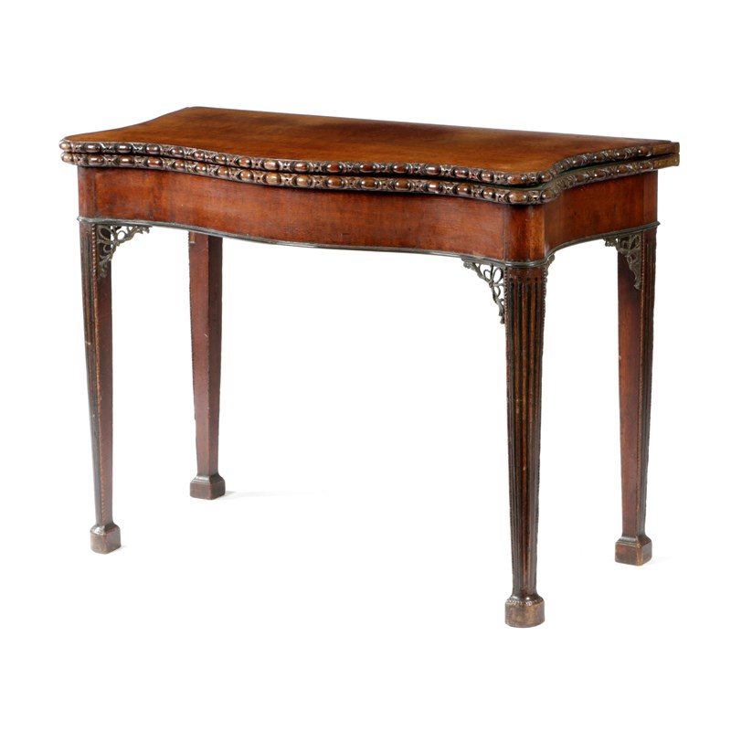 with an egg and dart carved moulded edge, with applied brass brackets and ebonised fluted legs