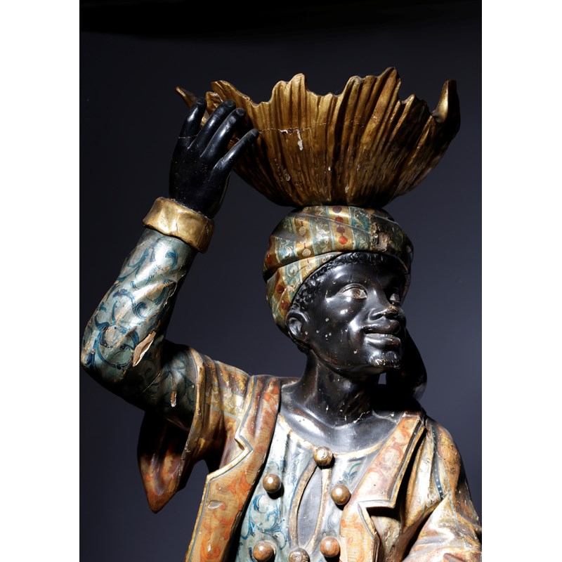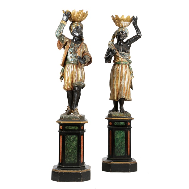A PAIR OF ITALIAN POLYCHROME DECORATED PINE BLACKAMOOR TORCHÈRES