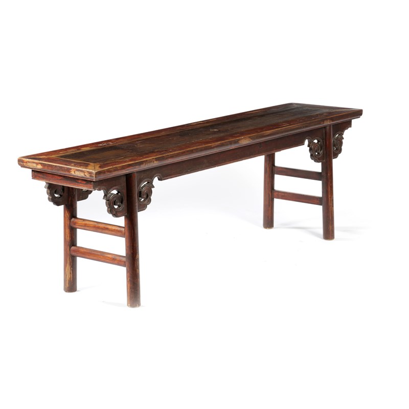 A CHINESE STAINED ELM AND PINE BENCH