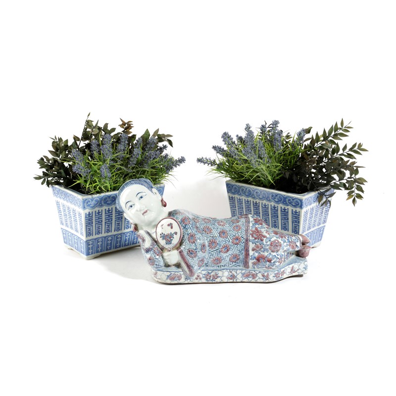 each of square section, together with a Chinese figural headrest or pillow modelled as a reclining maiden (3)