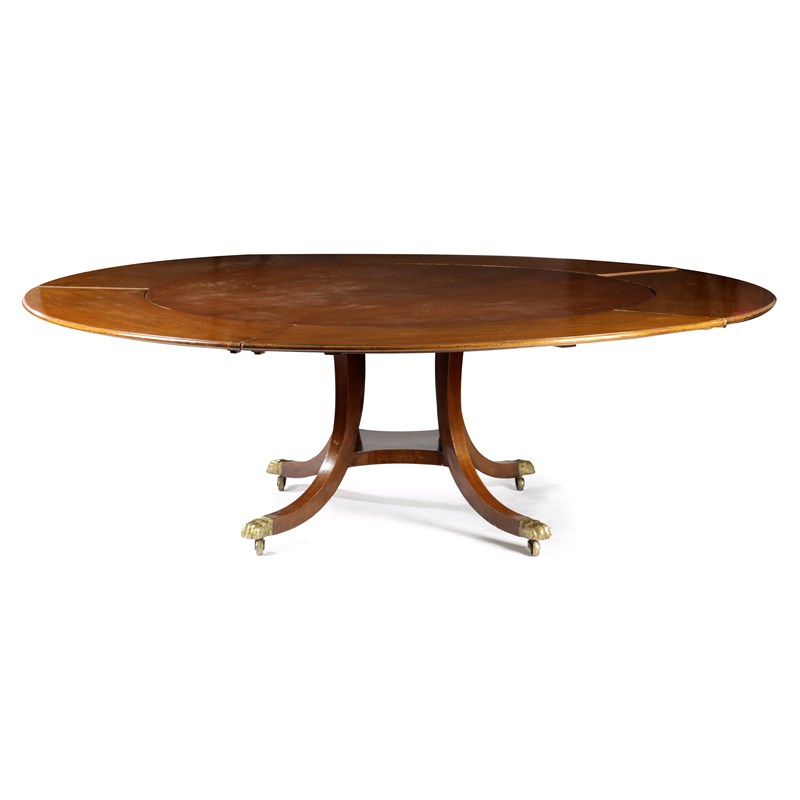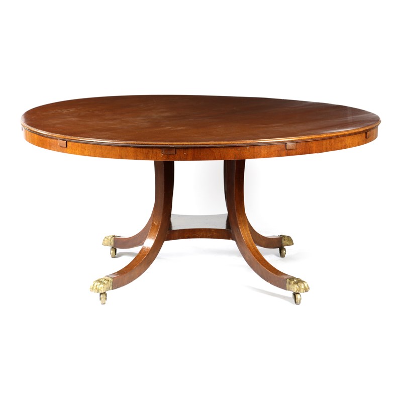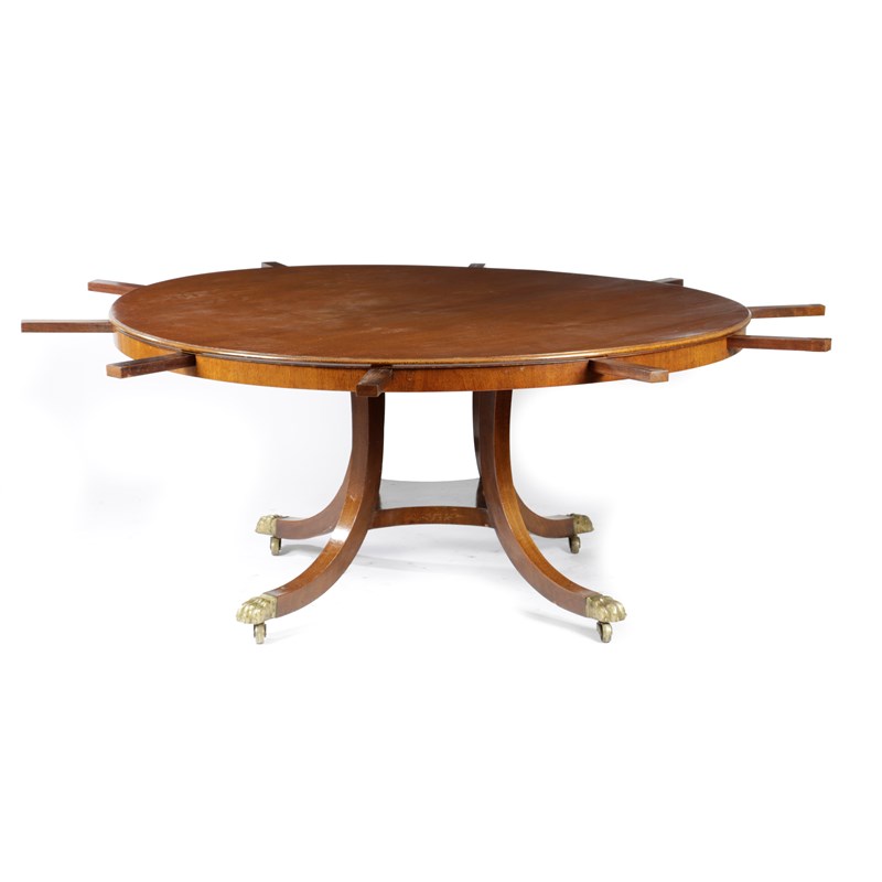 A MAHOGANY CIRCULAR EXTENDING DINING TABLE