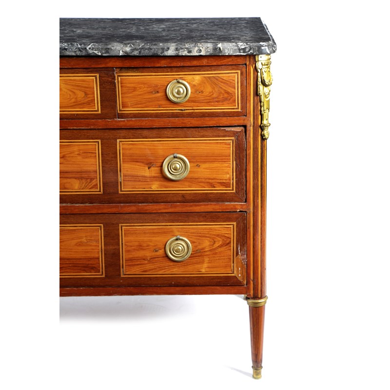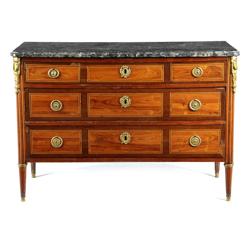 with ormolu mounts, the grey marble top above three short and two long drawers