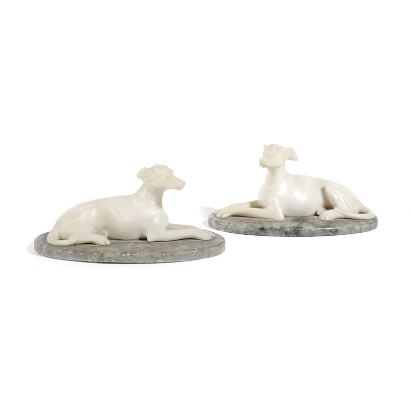 A PAIR OF ALABASTER MODELS OF RECUMBENT GREYHOUNDS