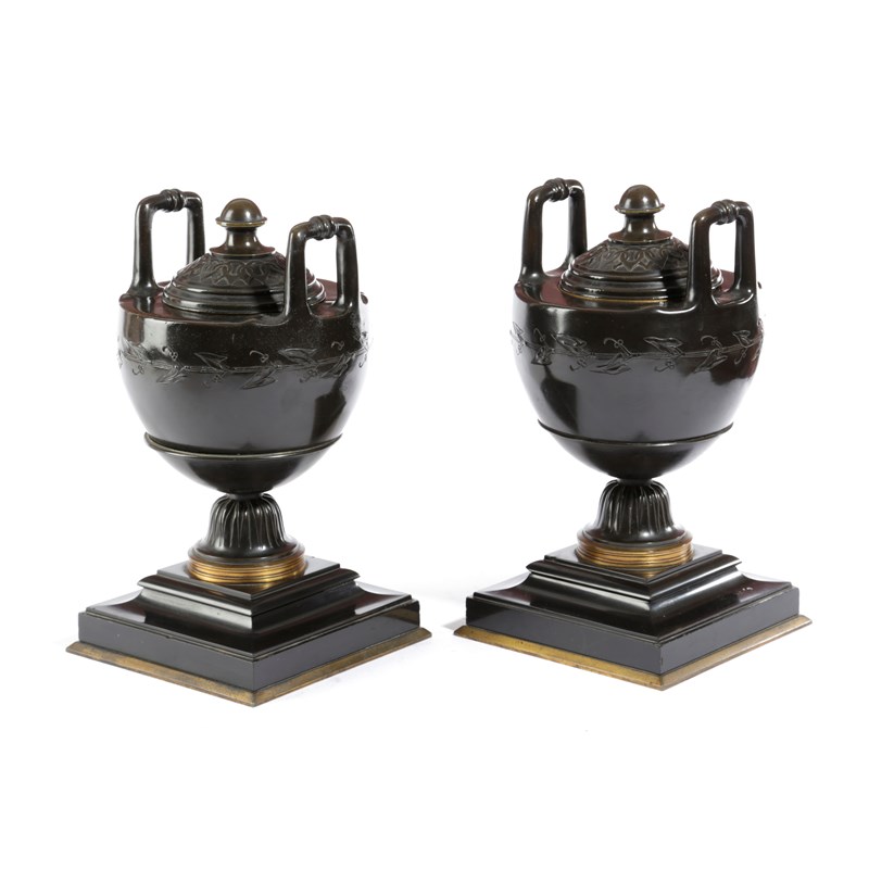 A PAIR OF FRENCH BRONZE GRAND TOUR URNS AND COVERS