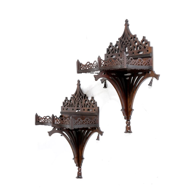 A PAIR OF MAHOGANY FRETWORK WALL BRACKETS