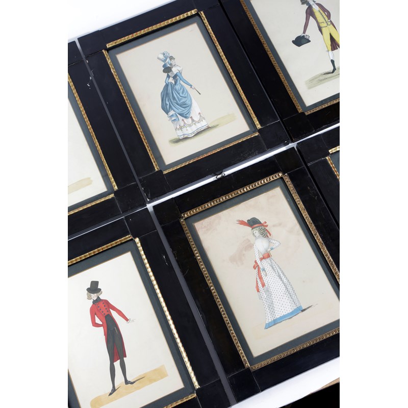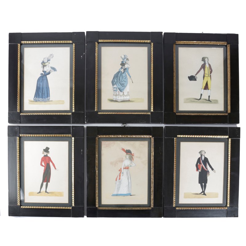 each with gouache and pen and ink, depicting a lady or a gentleman in Revolutionary costume, one with a Charles Plante Fine Arts label to verso, each in a glazed and gilt metal mounted ebonised frame (6)