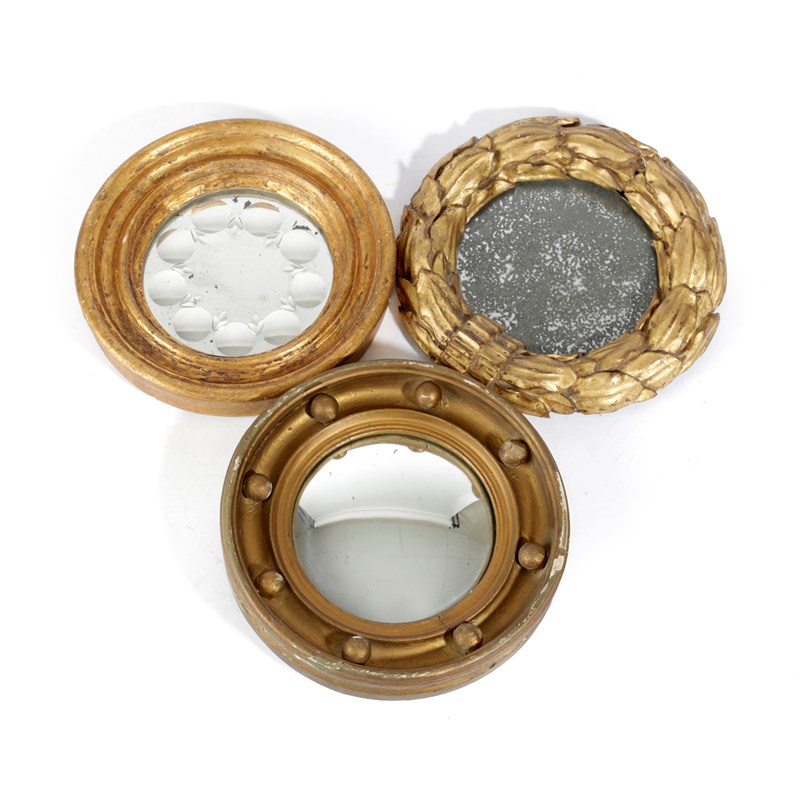 one with a convex circular plate within a ball decorated frame, one with a circular plate within a frame modelled as a laurel wreath, the other a sorcerer's mirror (3)