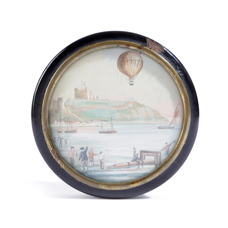 the top inset with a watercolour depicting the first balloon crossing of the English Channel with Dover Castle in the distance