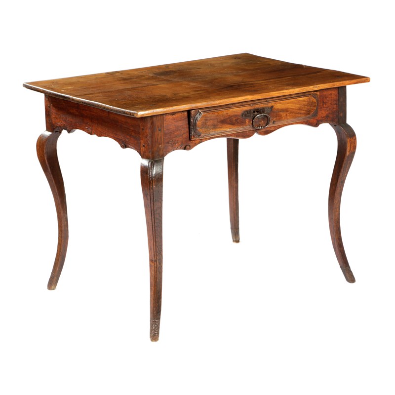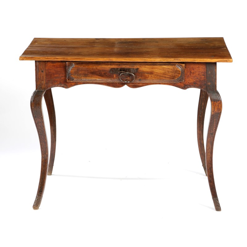 with a panelled freize drawer and a scrolled carved apron on cabriole legs, the feet carved with diamond lozenges