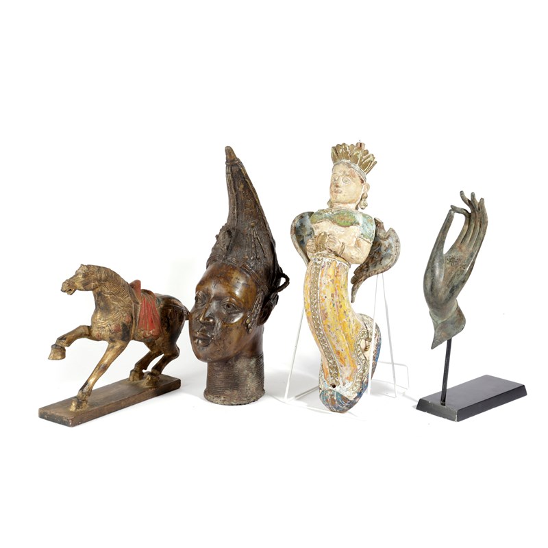 in vitarka mudra, later mounted on an ebonised plinth, together with a giltwood model of a horse, a South East Asian goddess figure and a bronze head in Benin style (4)