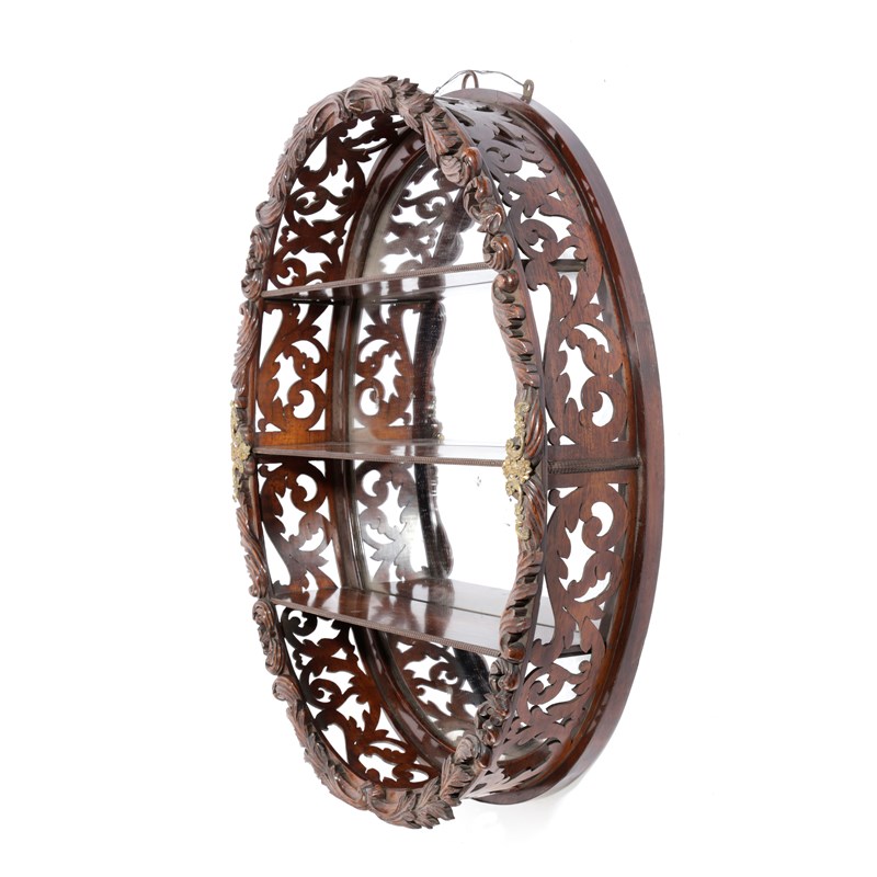 of oval form with a foliate carved and pierced border with gilt metal mounts, with three shelves before a mirrored back