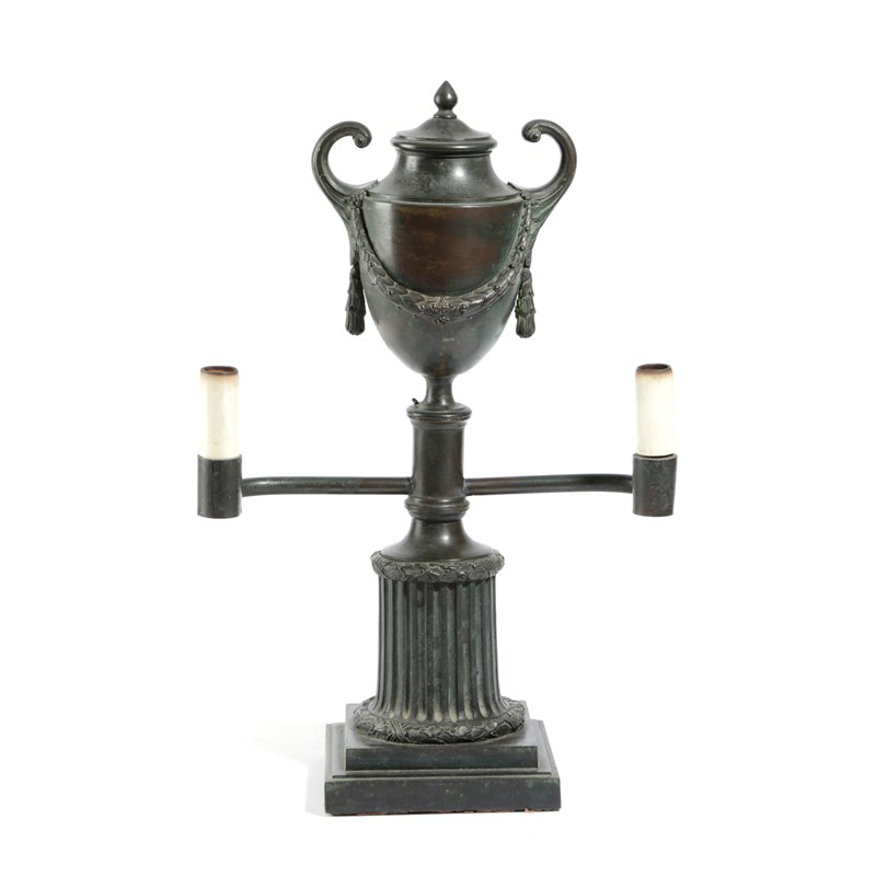 with a two handled urn above the lights and a short fluted column, fitted for electricity