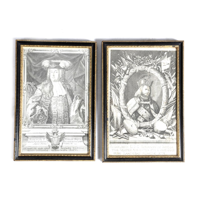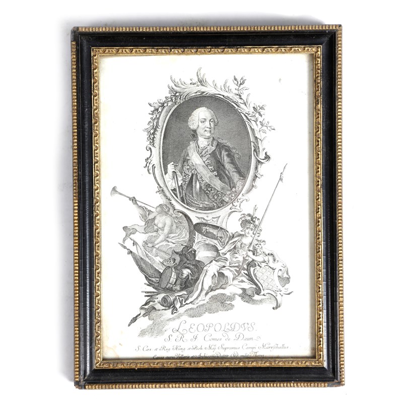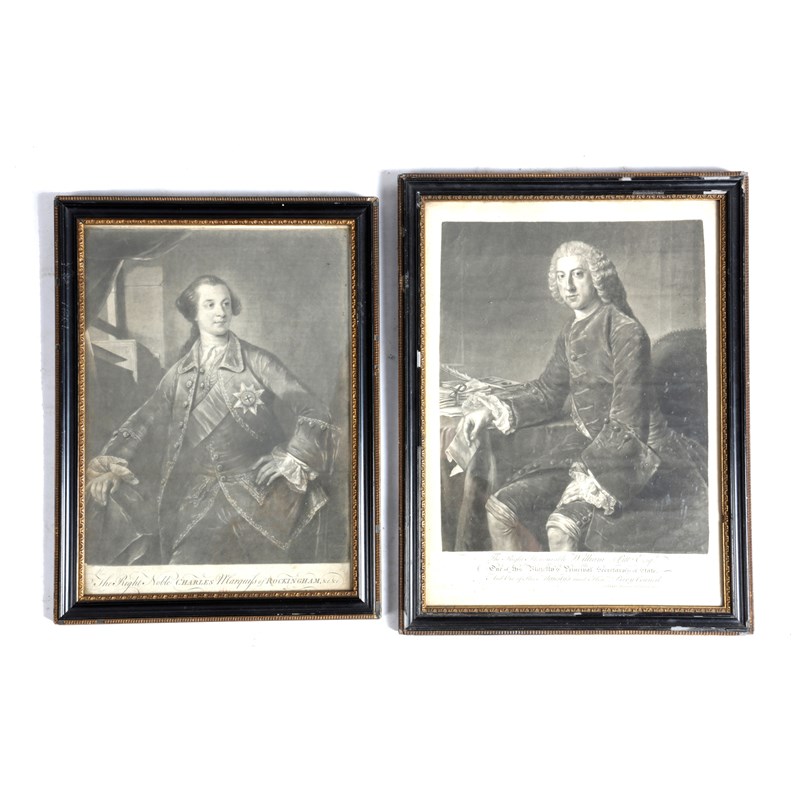 portraying 'The Right Honourable William Pitt Esq', 'Regina Anna D.G. Angliae Scotiae Franciae et Hibern.', 'Ernestus Gideon Baro de Laudon', 'Rudolphus L.D.G Romanorum Imperator', 'Justus Henningus Boehmerus', 'The Right Noble Charles Marquess of Rockingham', 'Leopoldus S.R.I. Comes de Daun', 'Franciscus I Roman. Imper.' and two others, each in a glazed Hogarth type frame, the backs with stencil marks for 'J. & W. VOKINS, MAKERS, 14, GREAT PORTLAND ST.' (10)
