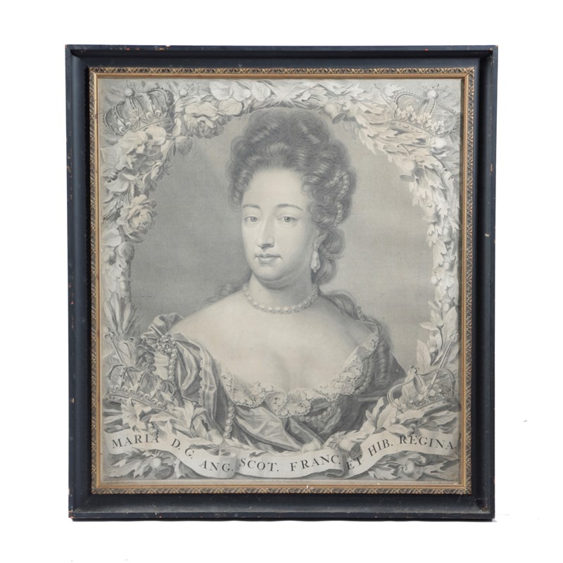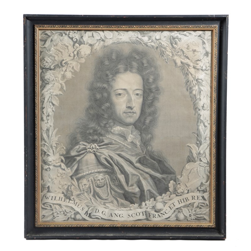 in floral cartouches above the mottos 'WILHELMUS III DG ANG SCOT FRANCE ET HIB REX / MARIA DG ....REGINA' (2)