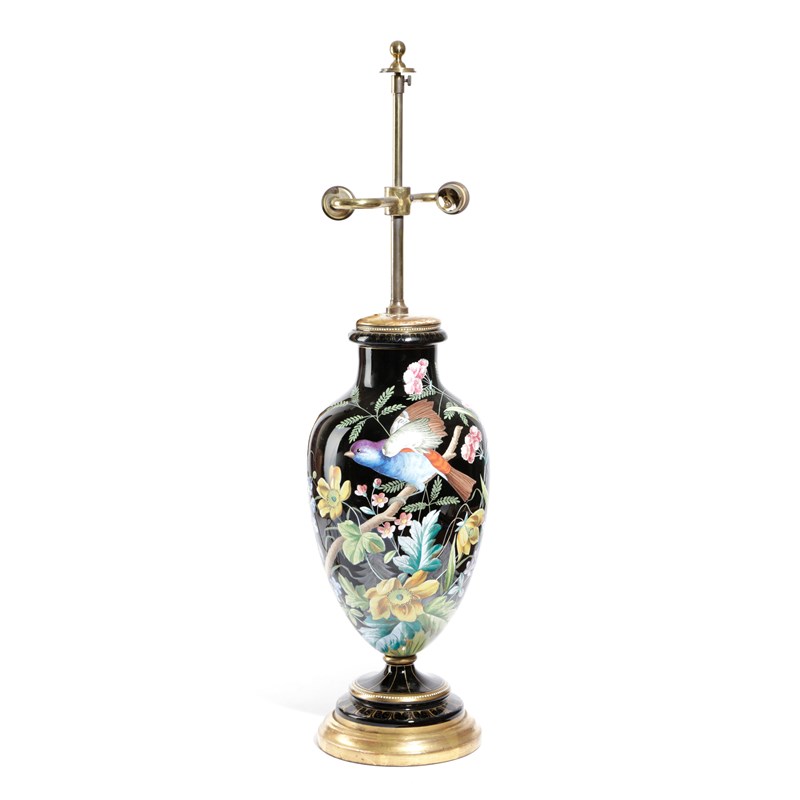 painted with an exotic bird amongst flowers on a 'clobbered' black ground with gilt and 'jewelled' highlights and giltwood base, with shade