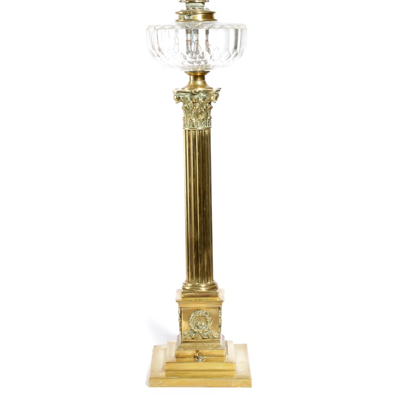 A BRASS CORINTHIAN COLUMN TABLE OIL LAMP