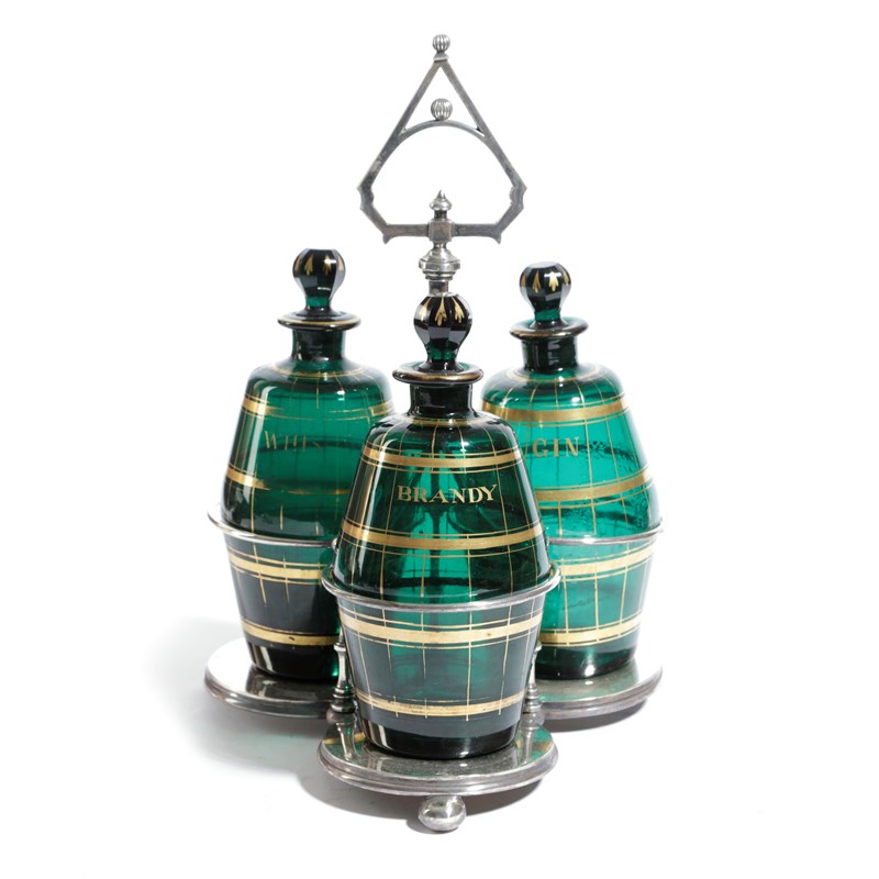 with gilt banded decoration and titled 'BRANDY', 'WHISKY' and 'GIN', in a later silver plated frame (4)