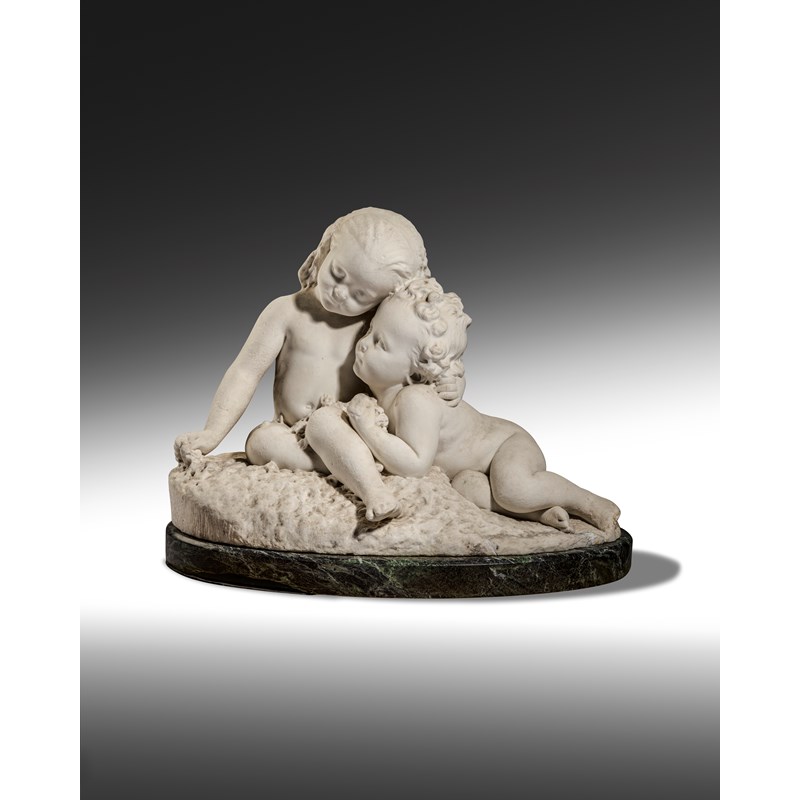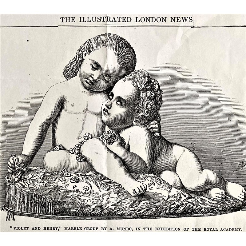 Alexander Munro was a Scottish sculptor who pioneered the move away from the academic style of the early 19th century towards the greater naturalism of the Pre-Raphaelite movement. Munro met Dante Gabriel Rossetti, John Everett Millais and Arthur Hughes at the Royal Academy Schools, which he joined following an invitation by the architect Charles Barry to work on the sculptural decoration of the new Parliament building. Though not formally part of the Pre-Raphaelite Brotherhood, Munro was closely associated with its members and shared a studio with Hughes for six years. Munro also met John Ruskin while teaching at the Working Men's College in Great Ormond Street alongside his fellow sculptor Thomas Woolner from 1855. The ideal of truth to nature set out by Ruskin is present in Munro’s work, as well as the Pre-Raphaelite interest in the Medieval world, encapsulated in his masterpiece Paolo and Francesca, first executed as plaster maquette for the 1851 Great Exhibition’s Sculpture Court and later in marble (Birmingham Museums and Art Gallery, accession number 1960P29). Munro was also an accomplished portraitist, exemplified by the group of six portraits of scientists he was commissioned for the Oxford University Museum by Professor Henry Acland, including a bust of the professor himself (Ashmolean Museum, accession number WA.OA1769). All these innovative features are encapsulated in the work offered here, Violet and Henry, exhibited at the Royal Academy in 1865. Described in full ‘Violet and Henry', and published in The Illustrated London News on 17 June 1865, it displays Munro’s technical virtuosity and the tender pathos that characterises much of his work, as well as his skill in imbuing liveliness in his portraiture. This work is closely related to the marble figural group titled ‘The Sisters’ which wasexhibited at the Royal Academy in 1857 and sold by Sotheby’s, London, 19th & 20th Century Sculpture, 12 December 2018.