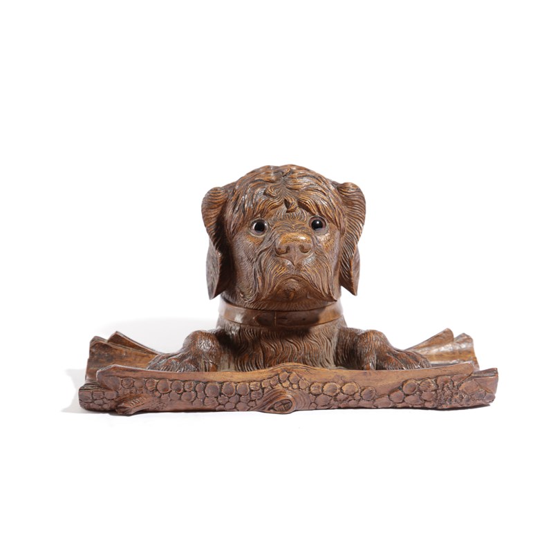 carved as a terrier's head with glass eyes, hinged enclosing a glass inkwell, above a naturalistically carved split log pen rest