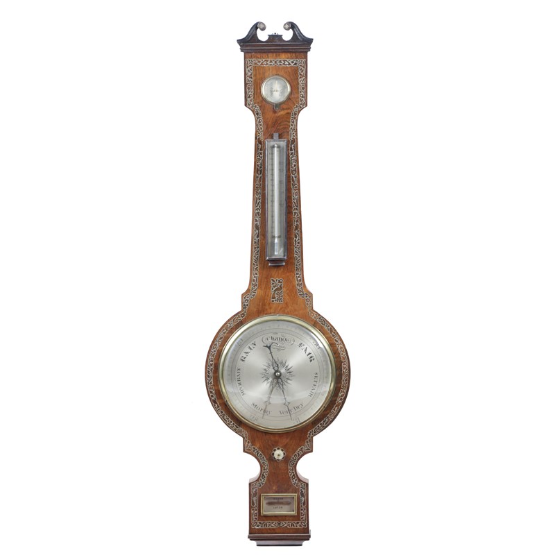 λ A VICTORIAN ROSEWOOD AND MOTHER OF PEARL WHEEL BAROMETER