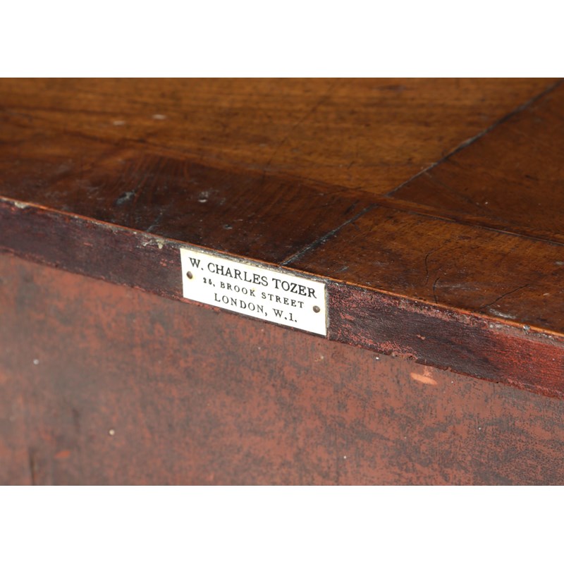 the interior with a needlework playing surface decorated with flowers, the underside with an ivorine trade label inscribed 'W. Charles Tozer 25, Brook Street, London, W.1.'