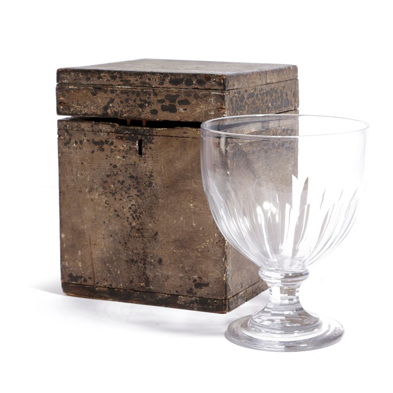 the rounded funnel bowl above moulded lappets, waisted stem and circular foot, with its original fitted wooden box