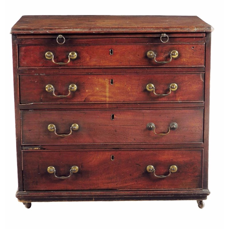 A small George III mahogany bachelor's chest by George Speer, the brushing slide with a printed paper trade label, above four long drawers and later castors, 74.9cm high, 78cm wide, 45.9cm deep.