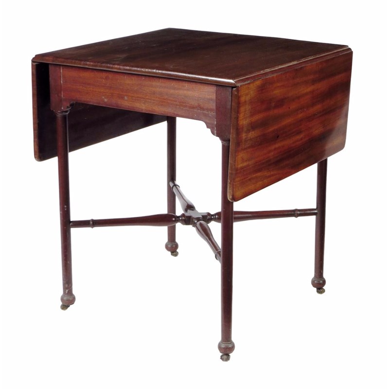 A George III mahogany Pembroke table, on turned legs united by a ring and baluster turned 'X' stretcher, on leather roller castors, 73.8cm high, 64.5cm wide, 60.8cm deep.
