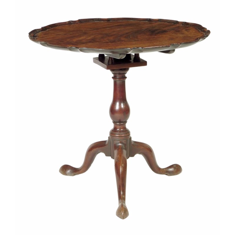 An early George III mahogany tripod table, the circular tilt-top with a piecrust edge, revolving on a birdcage, above a baluster turned stem, 70.3cm high, 76.6cm wide.