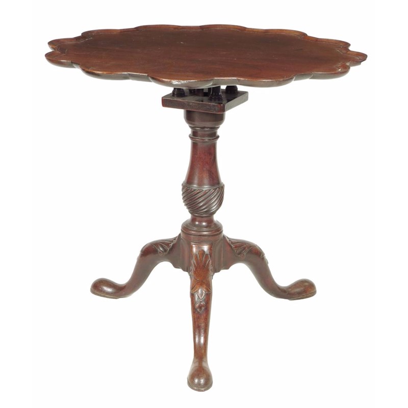 An early George III mahogany tripod table, the circular tilt-top with a piecrust edge, revolving on a birdcage on a turned and spiral ribbed stem and shell capped cabriole legs, 71.4cm high, 76cm wide.