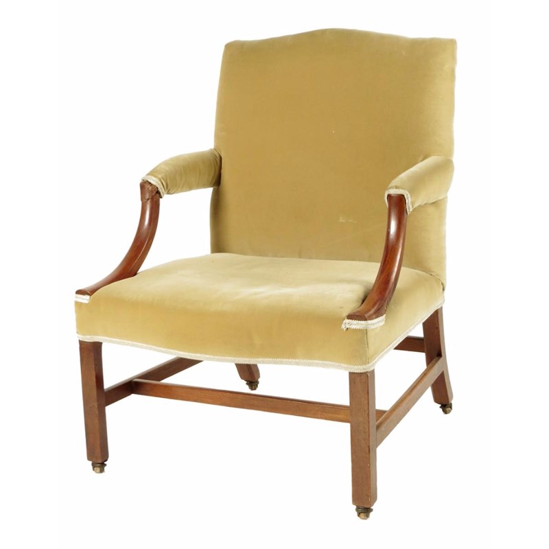 A George III mahogany 'Gainsborough' armchair, the serpentine padded back above downswept arms and chamfered front legs united by an 'H' stretcher on roller castors.