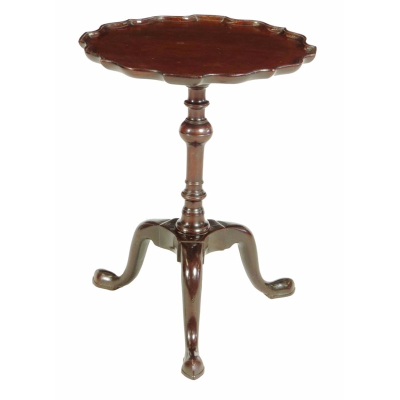 A small George II red walnut tripod table / kettle stand, the circular fixed top with a serpentine moulded edge on an inverted baluster stem and pointed pad feet, 52.8cm high, 40.2cm wide.