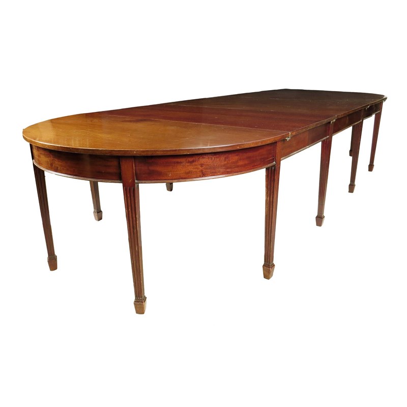 A George III and later mahogany dining table, comprising: a pair of 'D' ends and a central section with two additional leaves on fluted tapering legs and spade feet, 71.5cm high, 137.5cm wide, 360cm long (extended).
