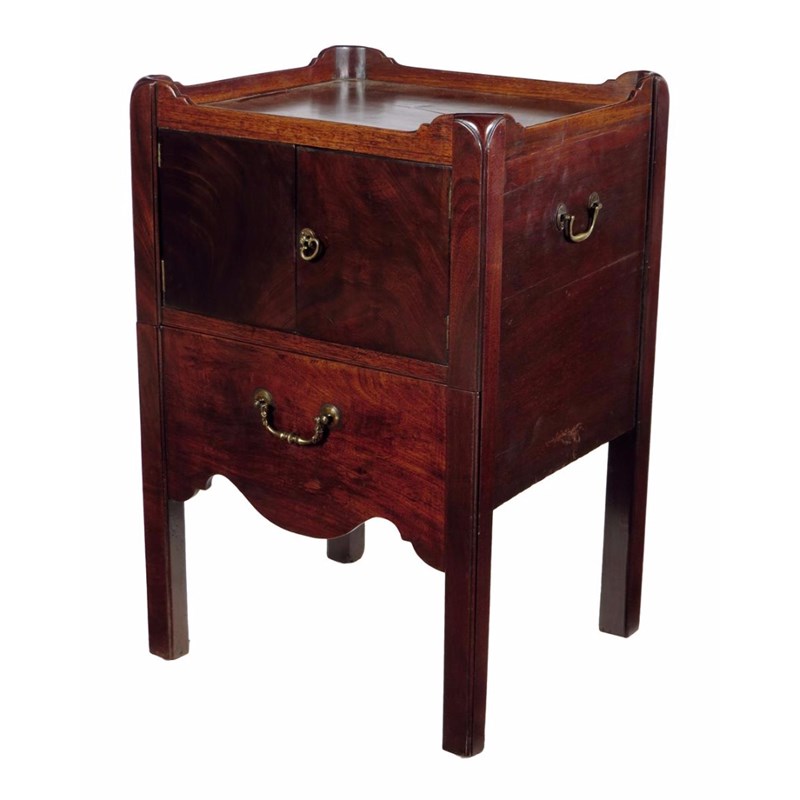 A George III mahogany tray-top bedside commode, with brass side carrying handles, with a pair of cupboard doors above a converted pull-out base, 77.5cm high, 50.5cm wide, 45.5cm deep.
